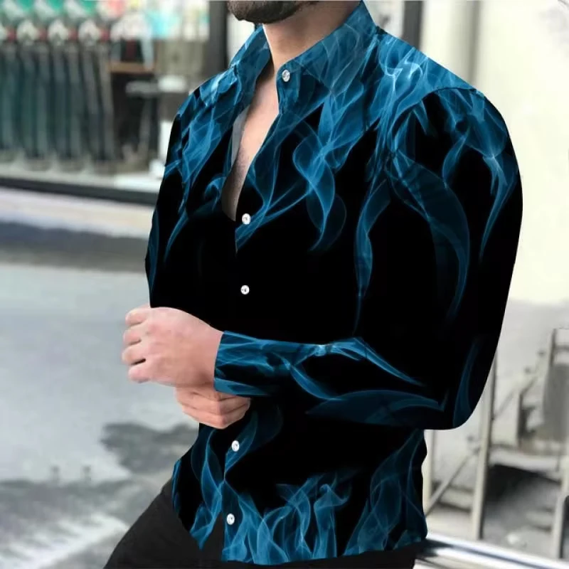 Men Shirts Turn-Down Collar Buttoned Shirt Casual Flame Print Long Sleeve Tops Mens Clothes